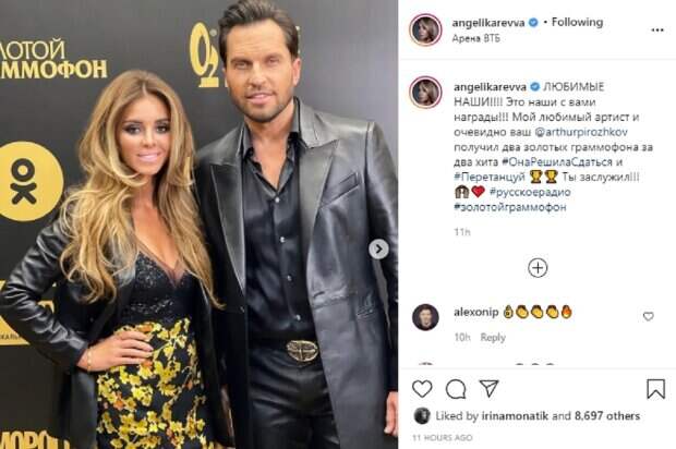 Анжелика выбрала короткое черно-желтое платье из кружевной ткани, изюминкой которого стало откровенное декольте. Поверх она накинула черный кожаный пиджак. На одном из фото счастливый Александр позирует без плаща, но с двумя статуэтками в руках. "Любимые наши!!!! Это наши с вами награды!!! Мой любимый артист и очевидно ваш Артур Пирожков получил два золотых граммофона за два хита #ОнаРешилаСдаться и #Перетанцуй