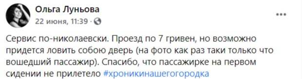 Как видно на фото, двери одной из николаевских маршруток упали на пассажира. Но мужчина успел их поймать одной рукой. "Сервис по - николаевски. Проезд по 7 гривен, но возможно придется ловить собой дверь (на фото как раз таки только что вошел пассажир). Спасибо, что пассажирке на первом сиденье не прилетело", - написала женщина. В комментариях украинцы возмутились, когда узнали о том, что произошло в маршрутке. Многие заметили, что такое происходит не впервые. Также они возмущаются, что транспорт в ненадлежащем состоянии и его давно нужно менять. "То дождь с крыши салон заливает,то двери отпадают...Наш транспорт и сервис несовместимые понятия", "Однажды я вывалилась из маршрутки на повороте вот с такой вот дверью", "Та это все пассажиры!! Ходят туда-сюда через двери, вот они и ломаются!". Напомним, что в Одессе таксисты подрались посреди улицы: видео разлетелось по сети. Как сообщала Politeka, дружеские посиделки в Харькове переросли в драку, в ход пошел топор: кадры с места событий. Также Politeka писала, что в Одессе маршрутчик подрался с пассажиром на дороге, видео.
