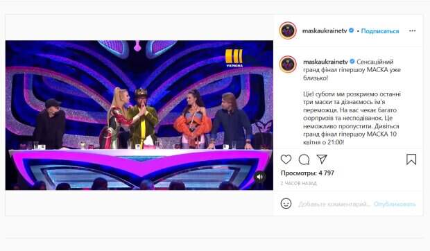 На официальной странице «Маски» в Инстаграм появилось видео с фрагментами финального эпизода шоу. По этим кадрам можно оценить, насколько насыщенным получился последний выпуск. Как известно, в финал прошли Солнце, Носорог и Дракон. На кадрах можно увидеть, как детективы обсуждают, кто может прятаться под этими масками, а позже реагируют на раскрытие личностей персонажей. При этом, детективы выглядят отчасти удивленными, а отчасти – счастливыми из-за того, что угадали. «Мы только что доперли, это…», - произносит Оля Полякова, после чего фрагмент обрывается. «А, точно», - говорит на следующем кадре Данилко. Также можно увидеть, что после объявления победителя шоу звездные детективы вскочили со своих мест. «В эту субботу мы раскроем последние три маски и узнаем имя победителя. Вас ждет много сюрпризов и неожиданностей», - говорится в подписи к видео. Украинцы активно комментируют кадры, делясь своими соображениями о возможном победителе. «Думаю, что выиграет Солнце», «Мне кажется, что выиграет Дракон», «О Сердючка выступит!», «Носорог и только он!», «Надеюсь что второй сезон будет скоро», - пишут люди. Напомним, Остапчук изменился до неузнаваемости, придирчивый Данилко не сдержал эмоций: "Вова, наконец. ..". Как сообщала Politeka, Приходько на шоу "Маска" показала округлившийся живот, Полякова не могла удержаться: "Настя, а есть...". Также Politeka писала, что в шоу "Маска" страсти накаляются, что известно об участниках: "Данилко сказал об аферистах...".