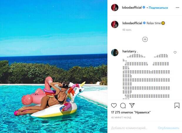 Для расслабленного отдыха певица выбрала черный купальник-бикини, прикрывающий лишь самые интимные места, и черную шляпу. Лобода эффектно позирует на круге, демонстрируя свой роскошный загар и плавные изгибы идеальной фигуры. «Время релакса», - коротко подписала снимок певица. Поклонники звезды тут же принялись комментировать ее фото. «Идеальная», «Фото супер», «шикарная», «Какие изгибы мать его», «Лободуся русалочка», «Шикарный вид!», «Какая аппетитная жареная курочка!», «У вас лето никогда не заканчивается фото солнечное а вы прекрасны», - пишут люди. До этого мы писали, что Лобода похвасталась роскошной фигурой во время отдыха. Так, на опубликованной фотографии Лобода позирует в эффектном мини-наряде, который подчеркивает ее и без того идеальную фигуру. Красотка позирует на фоне бассейна, а позади нее виднеются горы во время заката солнца. Несмотря на то, что кадр певица никак не подписала, поклонники Лободы буквально «взорвались» комментариями. Напомним, похудевшая Лобода покорила формами в эффектном мини на курорте: «Госпожа!». Как сообщала Politeka, младшая сестра Лободы в белоснежном наряде эффектно задрала ногу прямо в самолете: фото красавицы. Также Politeka писала, что похудевшая Лобода без лишней скромности показала прелести в «невидимом» бикини: «Я активно занималась…».