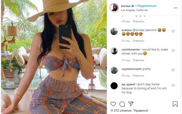 На личных фото и простых селфи девушка любит показывать себя Ким Ли продолжают сравнивать с известной моделью из семейства Кардашьян, поэтому личность молодой красотки становится все более узнаваема и обсуждаема на просторах сети. Девушка в целом может произвести хорошее впечатление на поклонников, ведь делится исключительно яркими фото и не переходит грани приличий, пляжные фото и кадры из отдыха также собирают больше всего комментариев. К примеру, фото Ким из отдыха порадовало фолловеров. Девушка надела серый лиф с принтом без завязок и такие же пляжные брюки в тон верхней части костюма. «Я пытаюсь оставаться милой в доме ☺️ Как у всех дела?», - написала Ли. Вот как реагируют в сети: «Богическая девочка