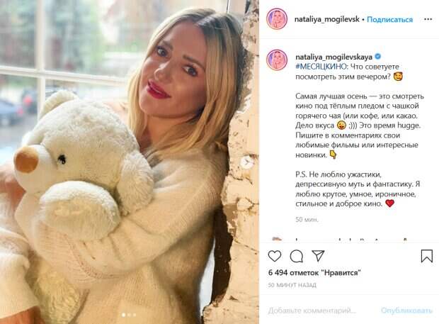 Дело вкуса;))) Это время hugge. Пишите в комментариях свои любимые фильмы или интересные новинки», - написала знаменитость. Она также поделилась новыми домашними фотографиями. На них Могилевская сидит на подоконнике в уютном свитере цвета слоновой кости. Певица нежно обнимает большого плюшевого медведя, прижимая его к себе. Поклонники Могилевской тут же откликнулись на ее пост. «Вам безумно идёт блонд», «Очень нежная и красивая!», «Какая милота. Невероятная!», «Вам так идет красная помада, а вы так редко ею пользуетесь», «Наташа Вам очень красиво быть блондинкой. И красная помада— бомба», «Так помолодела, красоточка, обворожительный взгляд», «Как девочка...милая и нежная», - пишут в комментариях. Ранее мы писали, что Могилевская выложила совместное фото со съемок шоу "Хто зверху", на котором запечатлена в обнимку с Лесей Никитюк и Дашей Астафьевой. Cудя по нарядам, выпуск готовился в преддверии Нового Года, ведь на самой Наталье Могилевской надет серый свитер с оленем, а на телеведущей - ярко-красное с капюшоном в стиле Деда Мороза. Даша Астафьева выбрала красный свитер с рельефной новогодней елочкой. Все три красотки улыбаются на камеру, а особенно радостный вид у Наташи Могилевской, которая на фото выглядит заметно моложе. Напомним, Могилевская в "уродливом" свитере дала жару вместе с Никитюк и Астафьевой, редкий кадр. Как сообщала Politeka, Могилевская с ярко накрашенными губами вызвала ажиотаж стилем 90-х: "Натали Портман". Также Politeka писала, что Могилевская кардинально сменила имидж, ошарашив новой внешностью.