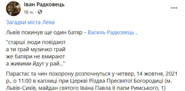 "Львов покинул еще один батяр – Василий Радковец. "Старші люди повідають, а ти грай, музичко, грай, же батяри не вмирають, а живими йдуть у рай", — написал Иван Радковец. 59-летний Василий Радковец был известен тем, что проводил Львовом тематические экскурсии. Его часто можно было увидеть в центре Львова. С 2017 году Василий Радковец работал ведущим специалистом в Центре развития туризма Львовского горсовета. Городской председатель Львова Андрей Садовый отметил, что известный львовский экскурсовод умер после тяжелой болезни. "Человек-бренд, человек-символ, человек-история. Большая потеря. Скорбим, сочувствуем родным и близким", — отметил мэр Львова. Прощание с Василием Радковцом состоится 14 октября в часовне при церкви Рождества Пресвятой Богородицы, что на площади святого Иоанна Павла II папы Римского на Сыхове. Напомним, дома украинца ждали жена и дочь: вражеская пуля настигла 24-летнего защитника. Как сообщала Politeka, в семье украинских биатлонисток случилась трагедия. Также Politeka писала, что украинский гонщик разбился в ДТП, от удара его выбросило из авто.