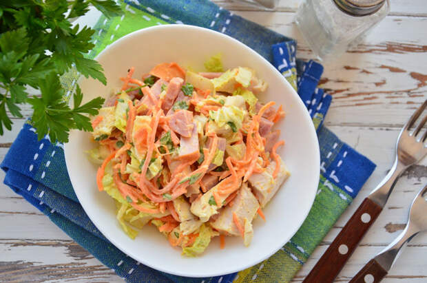 Салат Анастасия с курицей и ветчиной готовится достаточно быстро, конечно, если мясо сварить заранее. Такой салат – настоящая находка для праздничного меню, когда список и так велик, а некоторые кулинарные шедевры требуют немало времени и сил. Корейскую морковь также можно приготовить заранее или же купить готовую – если есть проверенные производители.