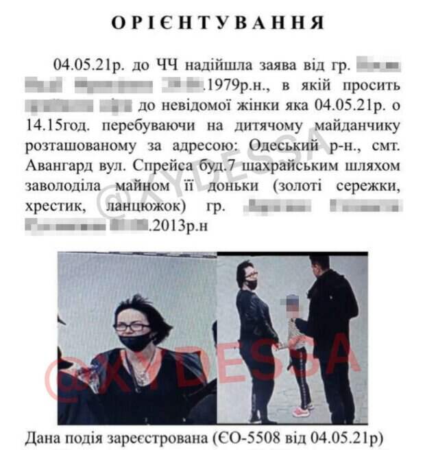 Под Одессой неизвестная женщина открыто похитила у 7-летней девочки золотые украшения Инцидент случился на детской площадке в поселке Авангард, во вторник, 4 мая. Об этом сообщили в телеграм-канале «Х. Одесса», передает Politeka.net В полицию обратилась мать ребенка и сообщила, что на детской площадке на улице Спрейса, 6, к ее дочери 2013 года рождения подошла неизвестная женщина и мошенническим путем завладела золотыми сережками, крестиком и цепочкой.