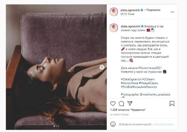 "Впервые я так сильно жду осени Скоро мы вместе будем плакать и смеяться, переживать, восхищаться и смотреть, как разгорается огонь в моём сердце! Всё, как в промо-ролике сезона: спящая пустыня превращается в цветущий сад…. Дата начала #Холостячка 2021 появится у меня на страничке", - написала Злата. Фанаты поставили более тысячи лайков и написали комментарии: "И мы вместе с Вами", "Не смотрела ни разу это шоу, но с вашим участием гляну)", "вот это реально крутые фото", "Удачи вам огромной, Злата, вы заслуживаете на то, чтобы найти свою любовь) женского вам счастья, какая вы красивая, повезёт же кому-то". Напомним, "Холостячка" Огневич в компании молодого мужчины вызвала споры в сети А еще Politeka писала, что "Холостячка" Огневич дала волю страсти на съемках, создатели раскрыли правду Также Politeka сообщала, что «Холостячка» Огневич раскрыла секреты, которые помогают ей быть счастливой