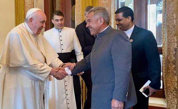 Сегодня в ходе своего рабочего визита в Бахрейн президент Татарстана Рустам Минниханов встретился с Папой Римским Франциском, сообщает пресс-служба главы республики. — Бахрейн в эти дни принимает у себя представительный и важный форум, посвященный вопросам диалога культур, конфессий и цивилизаций. Отрадно, что такие насущные для планеты вопросы обсуждаются с участием столь высоких представителей, как вы, — начал беседу Президент.