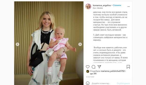 На этот раз топовый стилист Киева Ангелина Комарова, которая чуть меньше года назад стала мамой, поделилась с поклонниками своим опытом материнства и дала несколько советов, как совмещать карьеру и быть хорошей мамой. Женщина отметила, что как быстро выходить на работу после декрета и выходить ли вообще – это выбор каждого. Лично для нее важным пунктом стало обучение. Комарова спрашивала как правильно ухаживать за ребенком у квалифицированных врачей, в частности у известного Евгения Комаровского. "Для меня материнство-это огромное счастье. Но при этом мне жизненно необходимо участвовать и в других сферах жизни, быть активной", - написала сестра журналиста. Ранее Politeka писала, что Комаров из "Мир наизнанку" поразил странными ситуациями на съемках: "в сопровождении военизированной охраны" Напомним, что Комаров из "Мир наизнанку" растаял в объятиях загорелой жены: "нас всегда объединяет любовь" A еще Politeka сообщала, что Комаров из " Мир наизнанку "поразил украинцев новым фото, заинтриговав местом:" где это чудо природы...".