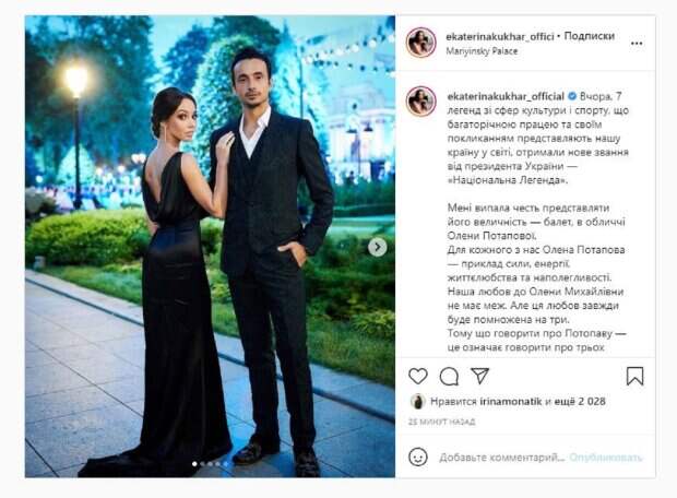 "Вчера, 7 легенд из сфер культуры и спорта, многолетним трудом и своим призванием представляют нашу страну в мире, получили новое звание от президента Украины - «Национальная Легенда». Мне выпала честь представлять его величество - балет, в лице Елены Потаповой. Для каждого из нас Елена Потапова - пример силы, энергии, жизнелюбия и настойчивости. Наша любовь к Елене Михайловне не имеет границ. Но эта любовь всегда будет умножена на три. Потому что говорить о Потопаву - это значит говорить о трех сестрах Потаповых: Елену, Анну и Варвару. Я, как руководитель главного балетного храма нашей страны @ksbc_official, на который направляю все свои силы и любовь, мечтаю, что смогу воспитать детей, которые будут продолжать писать триумфальную балетную историю, которую Елена Потапова начала в книге искусств Украины!", - написала красотка. Фанаты поставили более 2 тысяч лайков и написали комментарии: "Красивая", "Эстетические", "Очень красивая пара", "Красиво как", "Миниатюрная, милая и очень красивая". Напомним, Кухар из "Танців з зірками" не дала мужу одеться, прижавшись к нему всем телом А еще Politeka писала, что муж Кухар из «Танців з зірками» хвастнул красоткой-женой в эффектном платье с разрезом Также Politeka сообщала, что Кухар из "Танців з зірками" в прозрачном платье поразила "стеклянным" кадром