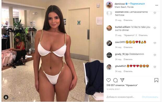 Деми обладает эффектной и даже экзотичной внешностью, а схожесть с Кайли Дженнер сделала ее еще более знаменитой. В белом бикини с золотыми цепочками вместо завязок и таком же лифчике белого цвета, девушке удалось превзойти саму себя. Благодаря лаконичному и одновременно с тем сдержанному образу, она стала выглядеть очень привлекательно. «Прогулка по шоуруме в моей новой коллекции для @ohpolly