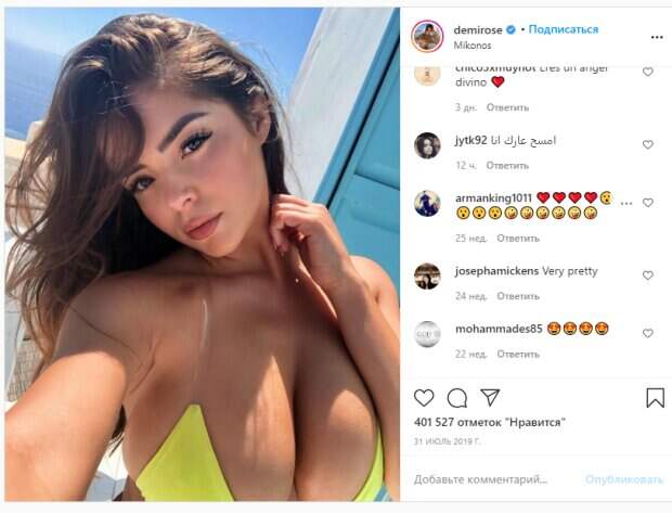 Нередко Роуз также показывает личные селфи и демонстрирует на них фигуру во всей красе в почти что незаметных бикини. Шестой размер бюста, тонкая талия и пышные бедра прославили девушку в Инстаграм, а ее выходки на отдыхе продолжают привлекать внимание фанатов. На одном из личных селфи Деми также решила показать, как выглядит ее бюст крупным планом в трендовом купальнике с силиконовыми и прозрачными лямками. Вот как реагируют в сети: «Горячая девушка лето