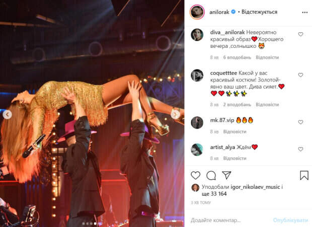 С новой прической певица уже засветилась на съемках «Вечернего Урганта». «Новый год уже близко! Вас ждёт множество праздничных выступлений! Хотим радовать вас и дарить яркие эмоции!», - подписала фото звезда. В комментариях ей оставили массу приятных отзывов. Многие девушки позавидовали физической форме певицы и посетовали на то, что спортивные залы закрыты из-за карантина. «Очень жду Ваших выступлений», «Красавица», «Волшебная», «Очень очень люблю вас», «Этот образ просто бомбический», «Обожаю Вас. Какая Вы шикарная», «Спасибо, за ваш труд!», «Обязательно будем смотреть все-все ваши выступления!», «Невероятно красивый образ, Хорошего вечера, солнышко», «Какой у вас красивый костюм! Золотой- явно ваш цвет. Дива сияет», - пишут пользователи сети. Отметим, что в последние несколько лет Ани Лорак живет и гастролирует в России. Напомним, что довольная Ани Лорак в окружении звездных красавчиков решилась на признание: «Лучшая...». Как сообщала Politeka, игривая Ани Лорак пошалила в машине и показала, как умеет целоваться: "рождена для...". Также Politeka писала, что Ани Лорак забыла о возрасте, втиснув пышный бюст в крохотный топик: «Это называется «добила».