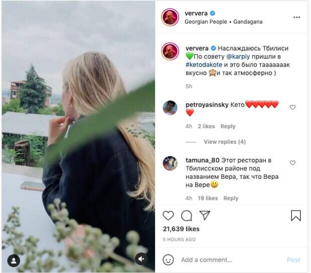 Певица активно ведет социальные сети, где делится с фанатами моментами из своей жизни. На этот раз Вера поделилась новым видео. На кадрах девушка сидит в ресторанне на крыше, с которого открывается панорамный вид в Тбилиси, Грузия. Туда она отправилась без своего супруга - Константина. "Наслаждаюсь Тбилиси. По совету подруги пришли в #ketodakote и это было тааааааак вкусно и так атмосферно)", подписала видео певица. В комментариях фанаты заметили, что Вера в последнее время одна, на что девушка дала ответ и заинтриговала своим спутником. "Как будто она одинокая женщина,всегда одна". Также поклонники исполнительницы поддержали её и восхитились видами Грузии: "Этот ресторан в Тбилисском районе под названием Вера, так что Вера на Вере", "Грузия - мечта. Особенно, когда еще не позавтракала", "Прекрасный город. Возвращаясь туда всегда вкусно и атмосферно". Напомним, Вере Брежневой стало плохо прямо во время съемок в Киеве, появились подробности: "Был такой эпизод..." Также, Брежнева в мини-шортах показала, как "отрывается" в Турции: "Вся одежда мокрая…" Ранее сообщалось, Брежнева засветила стройную фигуру в платье с декольте: "Всё лучше и лучше...".