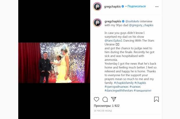 По словам Грега, отец чувствует себя намного лучше.  "Я чувствую такое облегчение и счастье, что он дома. Спасибо всем за поддержку, ваши молитвы так много значат для меня и моей семьи", - написал танцор.  К тексту сын Чапкиса прикрепил видео, где телеведущая Катя Осадчая берет небольшое интервью у Григория и Грега. Последний рассказал, что решил устроить сюрприз отцу и приехал на шоу "Танці з зірками". Для пожилого мужчины это был настоящий подарок, ведь он почти год не виделся с сыном.  Стоит отметить, что Грег живет в Сан-Франциско, где открыл большую школу хип-хопа.  За 16 часов пост собрал почти 2000 просмотров и много комментариев.  Пользователи сети желали здоровья отцу Грега и говорили о том, что оба очень милые.  Отметим, Григория Чапкиса госпитализировали 21 декабря с подозрением на китайский вирус.  Ранее мы писали, что Григорий Чапкис  принял участие в шоу "Годный год. Антикризис". По сюжету министр веселья запретил молодым артистам снимать проект из-за неприятностей в 2020-м. Несмотря на это, певец Иван Дорн решил провести съемки и устроил вечеринку у себя дома.  "Я пришел, чтобы сказать, что я не прав...", - заявил Чапкис, исполнивший роль министра веселья.