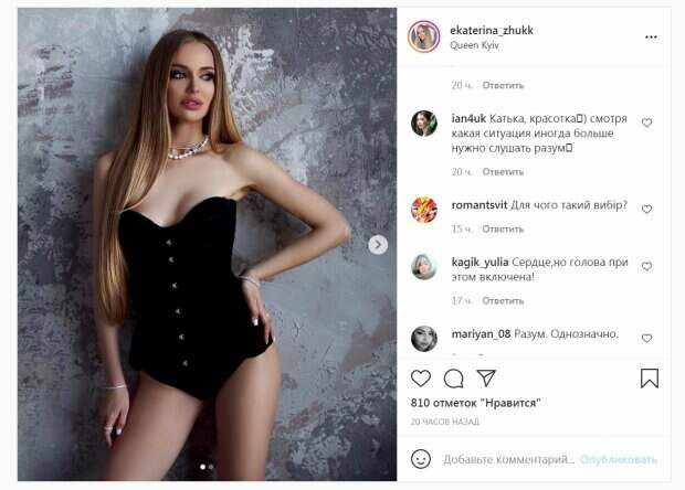 После ухода из шоу девушка продолжила вести свой блог, все также балуя подписчиков откровенными снимками. Так, в одном из последних постов Жук позировала в одном черном боди, демонстрируя свой изгиб талии с бедром. Длинные волосы и макияж акцентом на глаза стали отличным дополнением к столь жаркому образу. В посте красотка поставила людей перед сложным выбором. "Разум или сердце?)", - написала она. Публикация собрала сотни лайков и много комментариев. "Сердце❤️", "Или Екатерина Жукова )", "Катька, красотка