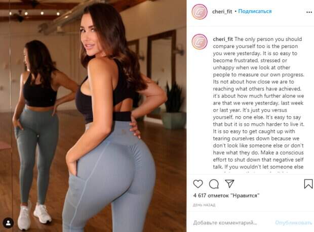 Также Ана делится мотивирующими видео и рассказывает о том, как преодолеть комплексы во время тренировок. На своей второй странице Чери решила поговорить о развитии и заодно поделилась очередным снимком, на котором показала новый фитнес-образ для занятий. «Единственный человек, с которым вы должны сравнивать себя, - это тот, кем вы были вчера. Когда мы смотрим на других людей, чтобы измерить свой прогресс, так легко разочароваться, нервничать или расстроиться. Дело не в том, насколько мы близки к достижению того, чего достигли другие, а в том, насколько мы дальше одиноки, чем были вчера, на прошлой неделе или в прошлом году. Если вы не позволяете кому-то другому говорить с вами плохим образом, не позволяйте себе так говорить с собой. Все мы красивы, сильны и способны меняться. Делайте каждый день шанс измениться к лучшему» - отмечает Ана. Вот как реагируют фанаты: «У тебя красивые бедра, спасибо большое, это очень интересно; мне нравится наблюдать за вашим развитием; вот, покрутись еще!; нельзя так много соблазнять; высшая степень соблазна; ну хватит, это поддерживает; вы совершенна