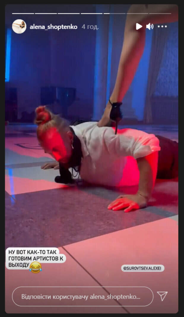 Главный хореограф шоу "Танці з зірками", известная танцовщица и чемпионка Алена Шоптенко показала, как проходит подготовка к шоу Как передает Politeka.net, в Инстаграм у красотки появились кадры со съемок, на которых танцовщик Алексей Суровцев отжимался от пола, пока на его спине стояла женская ножка.