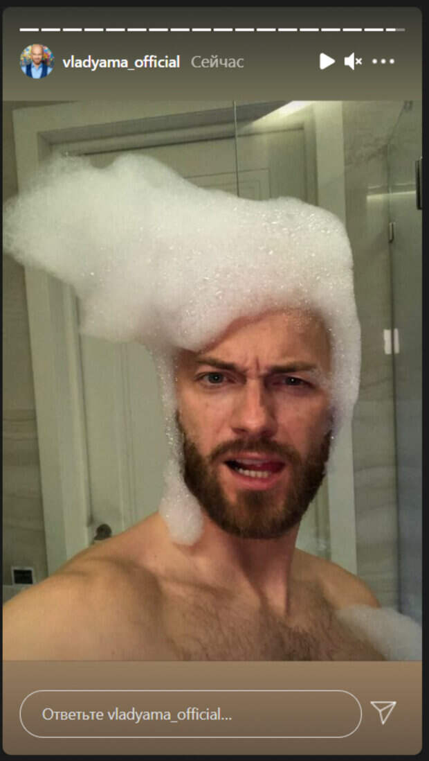 На голове артист соорудил невероятную прическу из пены. С первого взгляда она походила на прическу Элвиса Пресли или Смурфика. Сам Яма изобразил страстное лицо, позируя на камеру. Судя по всему, при помощи пены хореограф воплотил в жизнь свои тайные желания – иметь роскошную шевелюру. Сам Влад, как известно, предпочитает брить голову. Поклонники не смогли оставить комментарии к фото, так как Яма опубликовал его в сторис. Однако снимок наверняка рассмешил фанов, ведь хореограф наверняка, поделился своими пенными развлечениями с намерением поднять настроение своим поклонникам. Ранее мы писали, что Влад Яма показал, как развлекается под песню своей бывшей партнерши Натальи Могилевской. Яма был в клубе, где играла песня артистки. Он не сдержался и пустился в пляс. Несмотря на то, что хореограф был очень просто одет, он зажигал на полную. Напомним, что довольный Влад Яма блеснул торсом на роскошной яхте, фото уже в сети: "Наслаждается...". Как сообщала Politeka, Влад Яма усадил малолетнего сына-модника за руль роскошного авто: "У меня в пять лет тоже была...". Также Politeka писала, что Влад Яма в красных плавках устроил экстремальные развлечения, захватывающие кадры: "Уцепился за. ..".