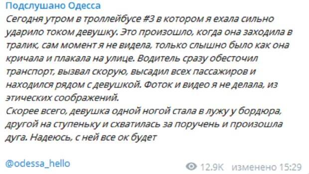 «Сам момент я не видела, только слышно было как она кричала и плакала на улице. Водитель сразу обесточил транспорт, вызвал скорую, высадил всех пассажиров и находился рядом с девушкой», - рассказала женщина. Судя по всему, пассажирка, заходя в троллейбус, могла оказаться под электрическим потенциалом, который при условии посадки данного пассажира с очень сырой поверхности, например, из лужи, мог стать ощутимым для человеческого организма. До этого мы сообщали, что посреди заснеженной скользкой одесской трассы иномарка столкнулась с грузовиком лоб в лоб. Так, на трассе Одесса-Киев произошло очередное смертельное ДТП. В Раздельнянском районе, у села Болгарка водитель Hyundai Elantra не справился с управлением, выехал на встречную полосу и столкнулся с грузовиком DAF. Мужчина легковушки погиб на месте, его данные еще устанавливаются, а его 28-летнюю пассажирку с травмами госпитализировала бригада скорой помощи. По предварительным данным инспекторов, ДТП произошло из-за того, что водитель иномарки не справился с управлением на заснеженной и скользкой дороге. Напомним, что в больнице Одессы ушел из жизни подросток, несмотря на все усилия врачей: трагические подробности А еще Politeka писала про страшную аварию на Молдаванке в Одессе: что известно о жертвах ДТП и в каком состоянии выжившие Также Politeka сообщала, что на трассе Киев-Одесса водитель сбил пешехода и дал по газам: пострадавшего переехала фура