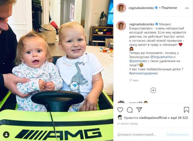 Лицо мальчика довольное, а у малышки перепуганное. В подписи Регина объяснила почему. Она назвала своего отпрыска любвеобильным ребенком. «Михаил Владиславович - очень напористый молодой человек. Если ему нравится девочка, он действует быстро четко и согласно своей новой привычке - сразу валит в траву и обнимает ❤️