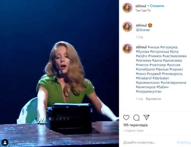 Украинская певица Тина Кароль удивила поклонников яркой выходкой на сцене Как передает Politeka.net, необычное видео, смонтированное из двух выступлений звезды появилось на фан-страничке Кароль. В первой части скромница Кароль сидит за столом с печатной машинкой. Она одета в зеленое мини-платье. Посреди номера красотка ногой скидывает машинку со стола и забирается на него верхом.