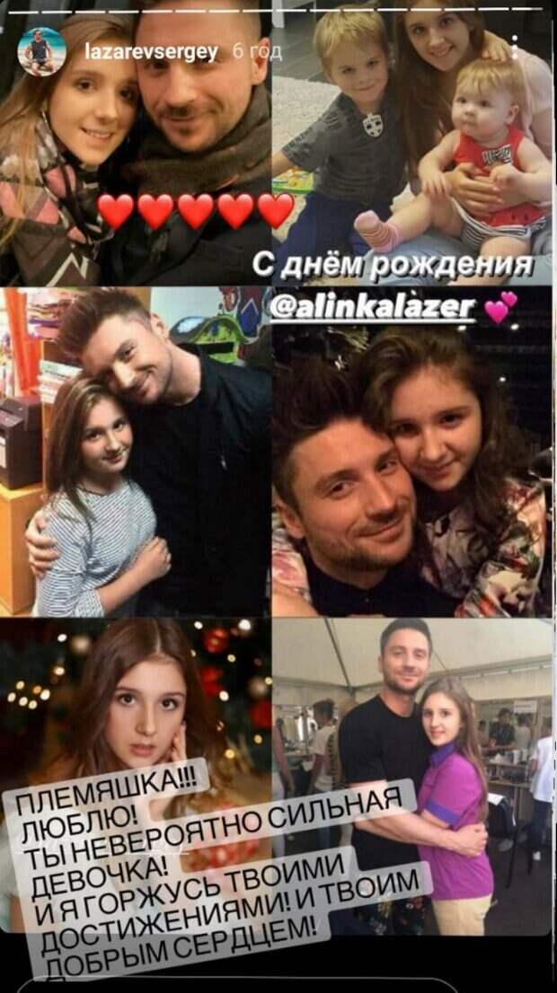 Племяшка! Люблю! Ты невероятно сильная девочка! И я горжусь твоими достижениями! И твоим добрым сердцем!», - написал артист. 24 января девушке исполнилось 17 лет. Помимо прилежной учебы Алина успевает заниматься музыкой. Раньше Алина пела в ансамбле «Непоседы», где раньше выступал и ее звездный дядя. Однако, в силу возраста племяннице Сергея пришлось покинуть коллектив. Лазарев утверждал, что никак не помогал племяннице попасть в коллектив. Отметим, что воспитанием 15-летней племянницы Сергея Лазарева занимается мать певца. Напомним, что отец Алины, старший брат Сергея Лазарева, погиб в 2015 году от внутреннего кровоизлияния после ДТП. В одном из интервью их мать Валентина Викторовна рассказывала, что сыновья были очень близки, поэтому Сергей сложно пережил утрату Павла. Алина как-то рассказывала, что Сергей Лазарев относится к ней, как к дочери. Напомним, мускулистый "любовник" Лорак полностью разделся, доведя до обморока: "Ну, наконец-то...". Как сообщала Politeka, "любовника" Ани Лорак Лазарева пристыдили за фото с сыном и дочерью: "Бедные детишки, сиротки". Также Politeka писала, что накаченный "любовник" Лорак Лазарев взбудоражил жарким танцем в маечке