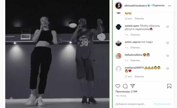 Известная певица Альбина Джанабаева, жена Валерия Меладзе, показала, как проводит досуг На кадрах красотка была в лосинах и топе черного цвета. Образ Альбина дополнила стильными кроссовками, позируя на танцевальной площадке. Рядом можно увидеть мужчину в шортах и майке, похожие на баскетбольную форму, а также кроссовках и кепке.