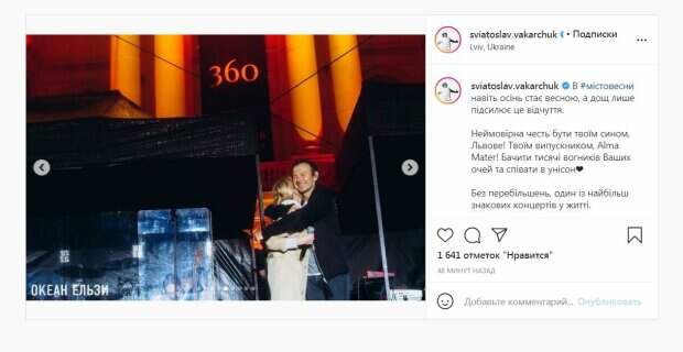 Также артист засветился в компании стройной блондинки - Ирины Швайдак из группы "Один в каное". Известно, что на днях два известных коллектива выпустили совместный хит "Місто весни". "#Містовесни даже осень становится весной, а дождь лишь усиливает это ощущение. Невероятная честь быть твоим сыном, Львов! Твоим выпускником, Alma Mater! Видеть тысячи огоньков Ваших глаз и петь в унисон❤️ Без преувеличений, один из самых знаковых концертов в жизни", - написал Вакарчук. За 50 минут публикация собрала более 1000 лайков и много комментариев. "Это было потрясающе! Очень благодарны Вам