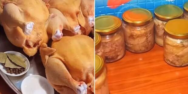 Вам понадобится: Целые тушки бройлерных цыплят; банки с крышками (по пол литра); большая кастрюля; старое полотенце; соль, лавровый лист, перец горошком Разрежьте курятину на порционные кусочки. Спинки, хрящи, нижние части голени и крыльев будут вариться отдельно. В тушенку пойдут лишь лучшие части. Из оставшегося мяса нужно сварить густой бульон.