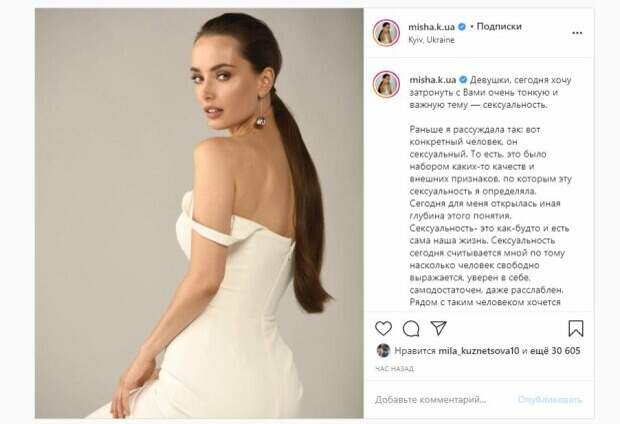 Об этом пишет Politeka.net со ссылкой на страничку знаменитости. "Девушки, сегодня хочу затронуть с Вами очень тонкую и важную тему — сексуальность. Раньше я рассуждала так: вот конкретный человек, он сексуальный. То есть, это было набором каких-то качеств и внешних признаков, по которым эту сексуальность я определяла. Сегодня для меня открылась иная глубина этого понятия. Сексуальность- это как-будто и есть сама наша жизнь. Сексуальность сегодня считывается мной по тому насколько человек свободно выражается, уверен в себе, самодостаточен, даже расслаблен", - написала красотка. Фанаты поставили более 30 тысяч лайков и написали комментарии: "Невероятная", "Спасибо за мотивация", "Вы очень красивая", "Вау", "Просто богиня", "Невеста-красавица", "Как тонко замечено", "Ксюша, счастья вам. Вы хорошая женщина". Мы писали, что украинская актриса Ксения Мишина, которая стала героиней шоу "Холостячка", стала рассуждать о судьбе. Стройная красотка предстала в белом облегающем платье с большим декольте. Наряд выделил ее пышную грудь, тонкую талию и красивые бедра. Напомним, "Холостячка" Мишина засветилась в гримерке с неизвестным красавчиком А еще Politeka сообщала, что сияющая "Холостячка" Мишина во всем белом неожиданно обратилась к украинцам Также Politeka писала, что скандальный поворот на "Холостячке", Мишина уже целуется с другим красавчиком