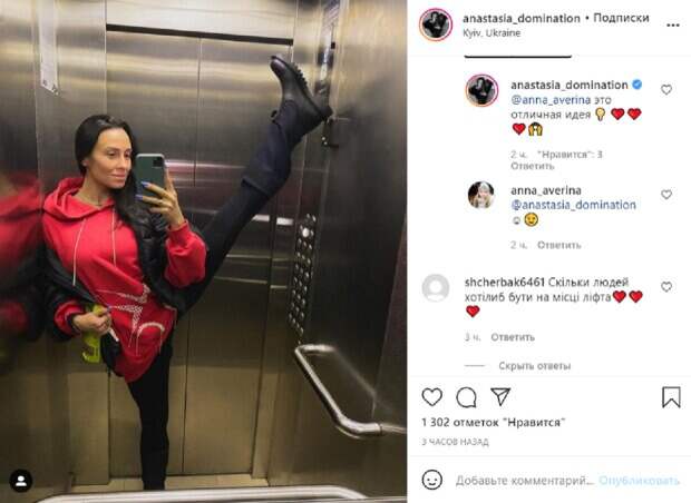 Девушка активно занимается спортом, поэтому и имеет роскошное тело, а также отличную растяжку. Анастасия любит хвастаться шпагами в соцсетях и получать массу восторженных комплиментов в свой адрес. После затишья Кумейко снова взялась за старое и эффектно задрала ножку в непригодном для этого месте, а именно в лифте. Настя была одета для прогулки: в красное худи, леггинсы, сапоги и черную куртку, которую она расстегнула и спустила с одного плеча, чтобы продемонстрировать свои выпуклости под одеждой. Также можно заметить, на лице не было ни грамма косметики. Восхищенная публика осталась довольна, о чем свидетельствуют множество комментариев под публикацией. "Нааастяяя