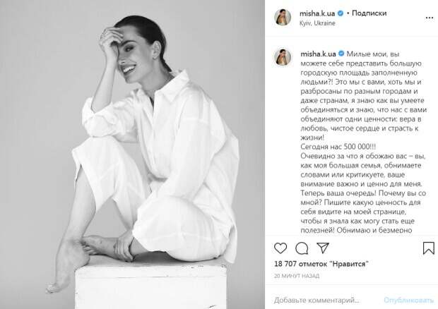 "Дорогие мои, вы можете себе представить большую городскую площадь, заполненную людьми?! Это мы с вами, хоть мы и разбросаны по разным городам и даже странам, я знаю, как вы умеете объединяться, и знаю, что нас с вами объединяют одни ценности: вера в любовь, чистое сердце и страсть к жизни! Сегодня нас 500 000!!!" - сообщила Мишина. Своих фолловеров "холостячка" назвала большой семьей и поблагодарила всех как за поддержку, так и за критику. "Пишите, какую ценность для себя видите на моей странице, чтобы я знала, как могу стать еще полезнее! Обнимаю и бесконечно благодарю", - написала она. "Вы - сильная и мудрая женщина. За вами приятно и интересно наблюдать. Шикарное фото", "Ты мотиватор, ты классная. Я тобой восхищаюсь", "Обожаю вас как актрису и смотрю "Холостячку". Думаю, в жизни вы хороший и искренний человек", "Ну какая же красивая", "С тобой, Ксю, потому что вдохновляешь", "Непревзойденная, сильная и искренняя", - пишут в комментариях. Напомним, стало известно о грандиозном возвращении "Холостячки" Мишиной на "Танцы со звездами". Также Politeka сообщала, чем запомнился второй эфир "Холостячки". Как писала Politeka, что разгоряченная "Холостячка" Мишина показала аппетитную фигуру в лучших образах.