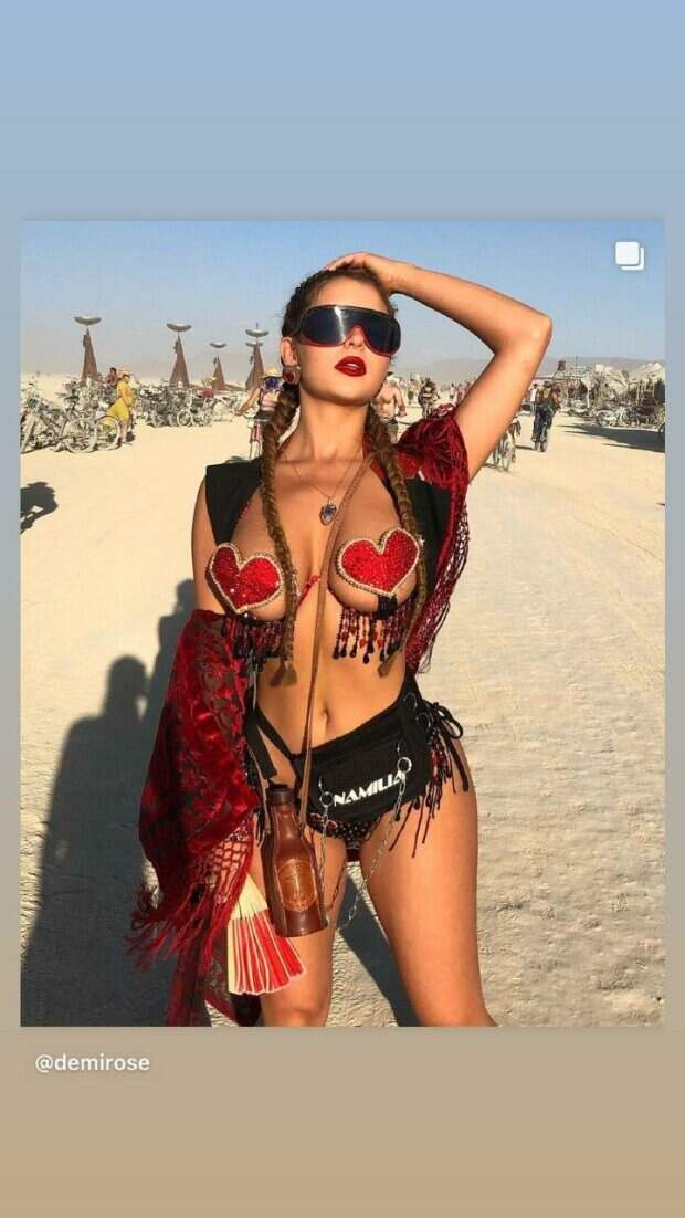 Британская модель Деми Роуз похвасталась роскошной фигурой, нарядившись в откровенный наряд ради фестиваля Об этом сообщает Politeka со ссылкой на Instagram знаменитости. Так, красотка предстает перед камерой в откровенном наряде без белья, эффектно прикрывая внушительные объемы наклейками. Дополнить образ «охотницы с пустошей» модель решила при помощи очков, накидки и бутылки с водой, которая свисала через плече.