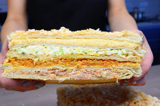 Впереди выходные и так хочется приготовить что-то вкусное для своей семьи. Я решила порадовать их вкусным пирогом. Готовить его легко, получается он очень вкусным и сытным. Попробуйте приготовить его вместе с нами! Полный список ингредиентов в конце статьи Способ приготовления: Для приготовления нам понадобится 6 слоёв (1,5 кг) бездрожжевого слоённого теста.