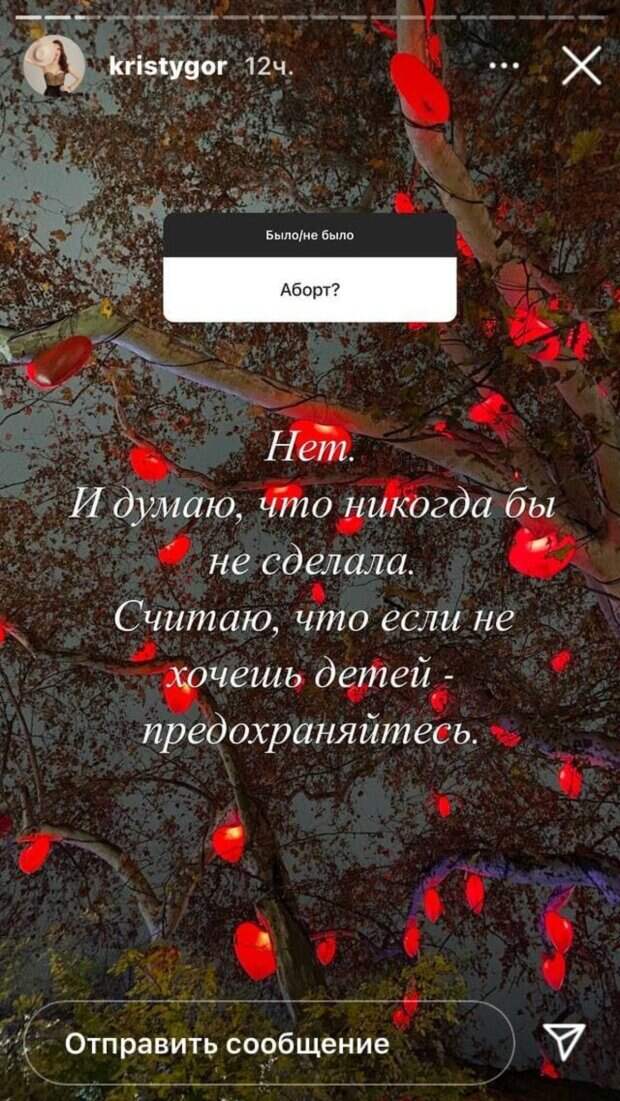 «Аборт?», - спросил один из подписчиков Кристину. «Нет. И думаю, что никогда бы не сделала. Считаю, что если не хочешь детей – предохраняйтесь», - честно ответила женщина. На вопрос про абьюзивные отношения Кристина тоже решила поделиться собственным опытом. Она отметила, что у нее были сложные неприятные отношения, но жизни в абьюзе не было. «Когда чувствую негатив – бегу и закрываюсь. Хочу больше позитива. Хочу ходить и улыбаться до неприличия много», - отметила красотка. Кроме этого, Кристина решила рассказать, что никогда не была обделена вниманием мужчин. По мнению девушки, у каждого свой путь. Кому-то хорошо одному, кому-то хорошо с семьей, а другим комфортно жить в гостевом браке. «Главное найти свой баланс, а не поддаваться общественному мнению», - подытожила Горняк. Напомним, что жена Владимира Остапчука побаловала ведущего, превратившись в горячую гейшу: "Женщина, которая умеет...". А еще Politeka писала, что жена Владимира Остапчука без капли скромности выставила ягодицы в обтягивающем наряде: "Крис, да ты огонь". Также Politeka сообщала, что жена Владимира Остапчука напугала состоянием после болезни, умоляла отвезти ее в больницу: "Я умираю...".