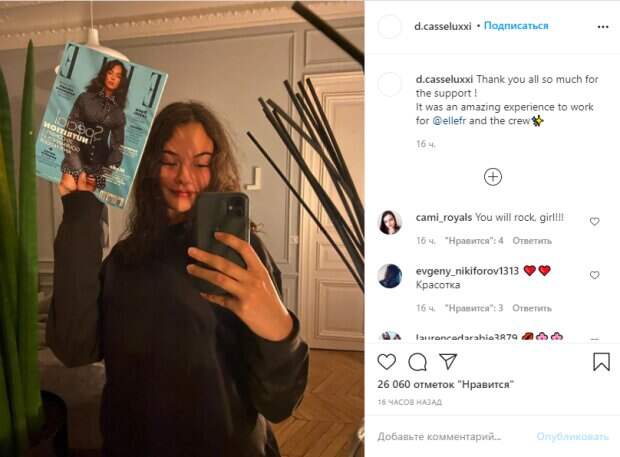 Жесткая ткань выгодно подчеркнула осиную талию модели. Кроме того в глаза бросается тот "хищный" взгляд, который будущая сердцеедка кинула в камеру. На селфи же Кассель одарила публику милой улыбкой и прелестным личиком без косметики. "Спасибо всем за поддержку! Это был потрясающий опыт работы для @ellefr и его команды✨", - подписала фото Дева. Пользователи кинулись комментировать "Ты будешь качать, девочка!!!" "❤️❤️Красотка" "Молодец, Дева это только начало долгого пути