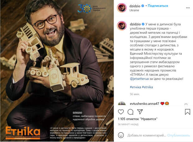 Артист активно ведет социальные сети и показывает поклонникам моменты из жизни. На этот раз певец поделился новой публикацией на своей странице в Инстаграм. На снимке Дзидзьо держит несколько деревянных игрушек в виде транспорта. "У меня в детстве была любимая первая игрушка - деревянная бабочка на палочке и колесиках. С деревянными изделиями и игрушками у меня связаны особые воспоминания из детства, с местом в котором я родился. Благодарен Министерству культуры и информационной политики за приглашение стать послом одного из ремесел фестиваля художественных народных промыслов «этника»! А также благодарю @jetsetterua за идею и реализацию!", поделился артист. Поклонники оценили игрушки и оставили комплименты певцу: "Чудесные игрушки, и на фото ты классный!", "Какие они чудесные", "Какие хорошие игрушки". Ранее сообщалось, Дзидзьо намекнул на примирение с экс-женой Slavia, похваставшись новой квартирой: "Спасибо, Михаил..." Также, Билык, Дзидзьо и другие украинцы скорбят по погибшему Кузьме Скрябину: "Вот где талант, а не ваши Винники..." Politeka рассказывала, Дзидзьо показал, как веселится после развода со Slavia: "Разминулись и поехали"