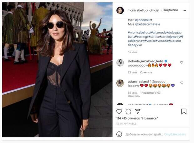 Звезда также активно ведет блог в социальной сети Инстаграм, где делится с фанатами всем интересным. На новых фото красотка была в костюме с прозрачной частью. Моника дополнила образ очками, стоя у красной дорожки. "В Венеции на Альта Мода @dolcegabbana", - написала Беллуччи под фотографией. Фолловеры поставили более 114 тысяч лайков и написали комментарии: "Вау", "Это любовь", "Да! Поехали 2021", "Обожаю твой стиль! Очень красиво и шикарно", "Какой сумасшедший наряд", "Ты выглядишь просто великолепно, Моника", "Сегодня у меня день рождения, пожелай мне, Моника", "Еще одна мечта Моники Беллуччи", "Ты выглядишь потрясающе, как ты всегда выглядишь ...". Напомним, дочь Моники Беллуччи изумила чувством стиля на подиуме, примеряв роскошное платье А еще Politeka сообщала, что Моника Беллуччи в темном кожаном наряде показала всю свою чувственность вместе с популярной подружкой Также Politeka писала, что неувядающая Моника Беллуччи оказалась вместе со знаменитой актрисой
