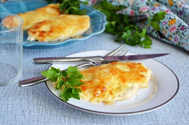 л. молотого сухого имбиря или тертого корня; 1 зубок чеснока; 2 ст.л. сливочного масла; щепотка соли; специи для курицы; 150 г твердого сыра; 3-4 ложки майонеза. Как делать Чеснок натереть, масло растопить, смешать с имбирем, солью, вином и ананасовым соком. Филе порезать на 4 пластины и замариновать в полученном маринаде минимум 30 минут, лучше час. Выложить курицу на смазанный растительным маслом противень, присыпать специями. Сверху разместить по 1-2 колечко ананаса. Сыр натереть на терке, смешать с майонезом и покрыть мясо. Выпекать 30 минут при 180 градусах. Приготовление курицы с ананасом