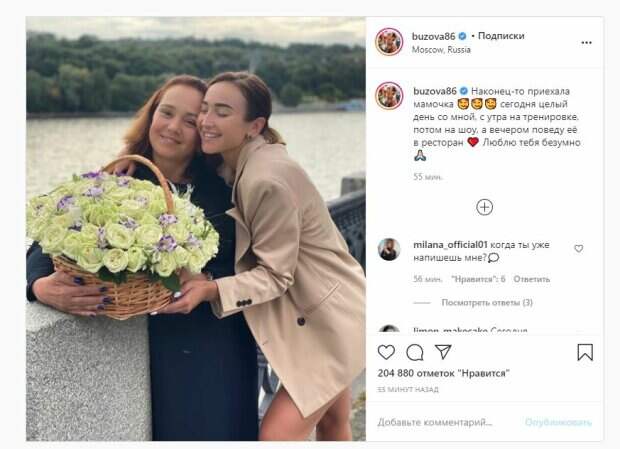 Парочка стояла на мосту, на фоне можно увидеть реку. Об этом пишет Politeka.net со ссылкой на страничку знаменитости. "Наконец-то приехала мамочка, сегодня целый день со мной, с утра на тренировке, потом на шоу, а вечером поведу её в ресторан. Люблю тебя безумно", - написала Оля. Фанаты поставили более 200 тысяч лайков и написали комментарии: "Какие красивые!", "Какие вы красавицы, мамочка отлично выглядит", "Мама все моложе и моложе", "Ой я думала сестра", "Когда мама выглядит моложе", "Красопетки", "Мама выглядит как старшая сестра", "Какие Вы обе красивые". Сообщалось, что российская певица Ольга Бузова шикарно отметила выход своего нового клипа. В Инстаграм у певицы появилось фото, на котором она предстала в невероятно красивом золотистом платье с корсетом. Девушка стояла в ресторане возле букета цветов. Выглядела она превосходно. «Красивая я, любимый мужчина, шикарные цветы и прекрасный ресторан - просто идеальный вечер. Я сейчас счастлива, и это главное», - подписала фото звезда. Напомним, разгоряченная Бузова вывалила бюст перед Киркоровым прямо на столе, кадры уже в сети Также Politeka сообщала, что Бузова без стыда в экстра-мини показала лучший ракурс в раздевалке А еще Politeka писала, что измученную Ольгу Бузову подловили на улице без тонны макияжа