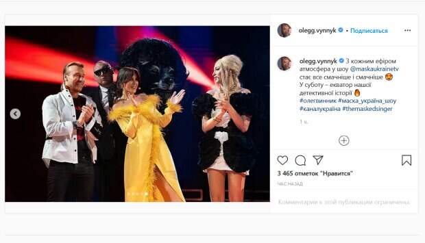 net. «С каждым эфиром атмосфера в шоу Маска становится все вкуснее и вкуснее. В субботу - экватор нашей детективной истории», - написал певец. Он также поделился снимками со съемок шоу. На них Винник предстал в образе с прошлого эфира: на нем черная футболка и белая рубашка. Помимо самого певца на снимках запечатлены и другие звездные детективы – Настя Каменских, Дзидзьо, Андрей Данилко и Оля Полякова. Поклонники Винника тут же отреагировали на его пост. «На счет вкуснее, Вы правы. Жду субботу с продолжением эмоций, загадок, интриг и счастливых моментов от шоу "Маска"», «С огромным нетерпением ждем!», «С вами смотреть одно удовольствие», «Фотки бомбезно шикарные», «Ну очень вкусно», «Мои прекрасные судьи обожаю вас всех с благодарностью», «очень ждем с нетерпением», - пишут люди. Напомним, Данилко, едва не лишившийся квартиры на Крещатике, окончательно потерял покой. Как сообщала Politeka, Олега Винника застала врасплох "внебрачная" дочь, неожиданные кадры: "Это кто?". Также Politeka писала, что Олег Винник чувственно приласкал тайную жену у всех на виду, любовь до гроба: "Какие они милые!".