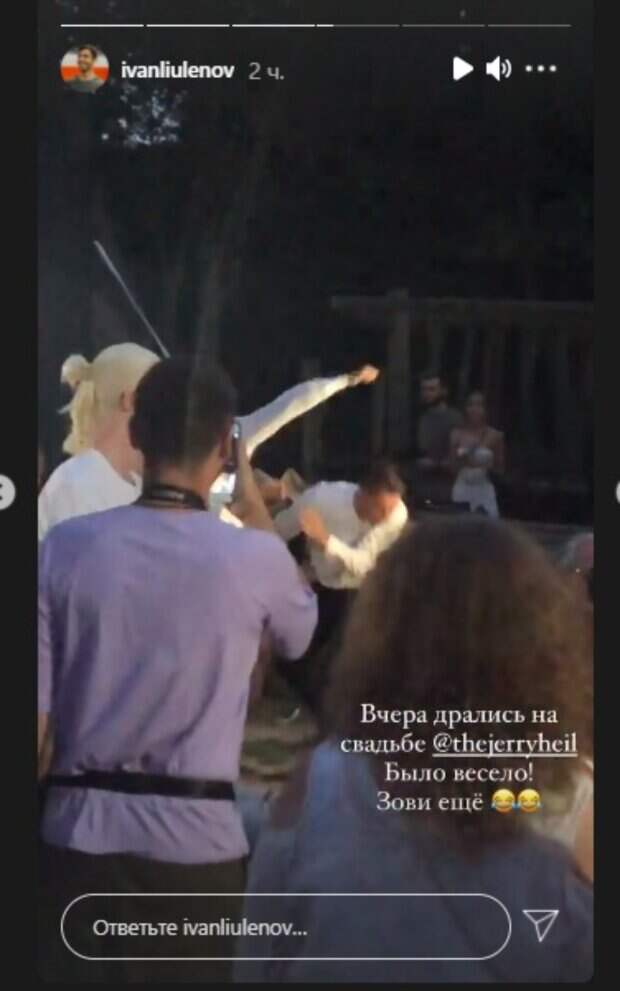 net. На них видно, как двое мужчин, окруженные многочисленными гостями, машут кулаками, расходятся, а затем снова кидаются в бой. Ведущему торжества не с первого раза удалось утихомирить дебоширов. "О, боже, что это такое?, - вопил он, - Нужно разнять их, наверно... Все, парни, хватит, стопэ". Произошедшее, по всему, повеселило Люленова. "Вчера дрались на свадьбе Jerry Heil. Было весело! Зови еще
