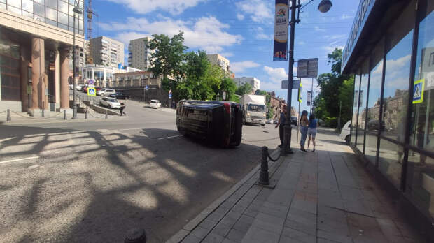 Серьезная авария произошла в центре Владивостока в 17.15 по местному времени, сообщает ИА DEITA.RU.Внедорожник ехал по Океанскому проспекту прямо по левой полосе. В это же время грузовик JAC начал поворачивать влево, на улицу Прапорщика Комарова из полосы средней. От удара китайского чуда техники внедорожник завалился на бок, прочертив бортом Океанский проспект.