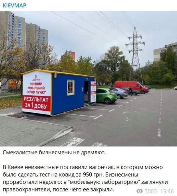 Бизнесмены проработали недолго: в "мобильную лабораторию" заглянули правоохранители, после чего ее закрыли", - говорится в сообщении. В комментариях высказывают сомнения по поводу того, что организаторы такого "бизнеса" предоставляли людям достоверные результаты тестов. "Думаю, там брали анализы, но никуда их не возили", "сделали бы скидку 50% для пенсионеров и собрали бы очередь", "аферы не пройдет", "неудачный стартап", - пишут в комментариях. Ранее сообщалось, что за сутки наибольшее количество заболевших китайским вирусом обнаружили в Киеве и четырех областях. Так, за последние сутки, 8 ноября, наибольшее количество подтвержденных случаев зарегистрировано в Киеве (748), Харьковской (717), Запорожской (683), Житомирской (636) и Киевской (590) областях. Напомним, киевские хрущевки снесут, названы адреса "счастливчиков": "под удар первыми попадут...". Ранее Politeka писала, что в Киеве пропала девушка, фото: оставила ребенка у знакомых. Также Politeka сообщала, что в Киеве загадочно оборвались жизни матери и ребенка: видео и подробности с места трагедии.