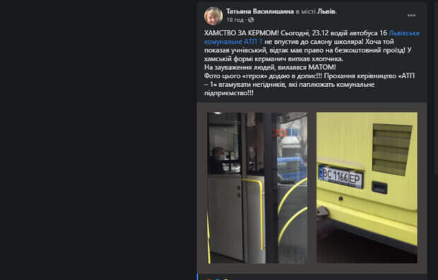 Водитель маршрутки отказался перевозить ребенка несмотря на то, что он предъявил нужный для проезда документ Как передает Politeka.net, произошедшее в одном из Львовских автобусов описала жительница города в соцсетях. Инцидент произошел в среду, 23 декабря. "Водитель автобуса 16 Львовское коммунальное АТП 1 не пустил в салон школьника!