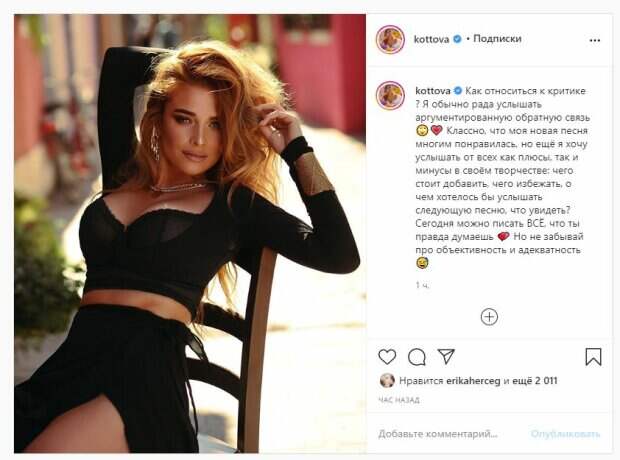 Об этом пишет Politeka.net со ссылкой на страничку знаменитости. "Как относиться к критике ? Я обычно рада услышать аргументированную обратную связь. Классно, что моя новая песня многим понравилась, но ещё я хочу услышать от всех как плюсы, так и минусы в своём творчестве: чего стоит добавить, чего избежать, о чем хотелось бы услышать следующую песню, что увидеть? Сегодня можно писать ВСЁ, что ты правда думаешь. Но не забывай про объективность и адекватность", - написала Котова. Фанаты поставили более двух тысяч лайков и написали комментарии: "Какая же ты красотка, не могу свести с тебя глаза, если честно слушаю все песни, даже твои больше всего", "Мне в ваших песнях и в вашем исполнении нравится абсолютно всё. Я вдохновляюсь вами и вашим творчеством", "Объективно и адекватно у Котовой нет голоса, есть вопросы? музыка ужасная банальность и примттивность", "Я не критик. Я любитель. Слушаю, то что цепляет за душу. Поэтому ваши песни меня очень трогают". Напомним, знойная блондинка из "ВИА Гры" пошалила в пижаме на диване А еще Politeka писала, что блондинка из "ВИА Гры" задрала ногу и показала формы со смелого ракурса Также Politeka сообщала, что блондинка из "ВИА Гры" в мини-бикини показала, как выглядит рай