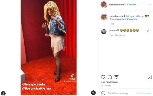 Образ артистки дополнила объемная прическа с кудрями и серьги-кольца. Сама Кравец объяснила, что ей достался образ Тины Тернер. "Образ Тины Тернер близок мне свободой духа, и приятно, что появился шанс прикоснуться к легенде. Уже несколько недель я провожу все свое время в наушниках, прослушивая только ее песни. Смотрю очень много видео, пытаюсь повторить все тонкости в артикуляции, в манере двигаться, в повороте головы артистки. Смотрю, как она поднимает или опускает глаза, как двигаются ее руки. Сначала все считываю, а потом буду представят в своем стиле", - рассказала Елена Кравец. Отмечается, что на телеканале готовят новое шоу "сенсационных пародий". Как видно на ролике, Кравец прекрасно воплотилась в свой образ и по-настоящему насладилась новым амплуа. Напомним, Елену Кравец неожиданно вычеркнули из программы "женского квартала", украинцы ахнули: "скатились" Как сообщала Politeka, Кравец из "Квартала 95" в тельняшке заинтриговала кадрами, как потеет в танцзале: "что-то будет!" Также Politeka писала, что худенькая Кошевой, неузнаваемая Портной и весельчак Ткач: как выглядели влюбленные звезды "Квартала 95" в молодости