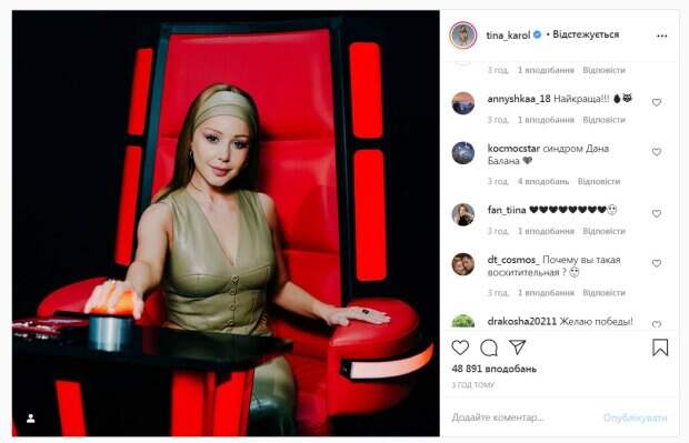 Так, Кароль показала фото, на котором запечатлена в судейском кресле. Певица нарядилась в кожаную жилетку с пикантными вырезами на боках. и юбку светло-оливкового цвета. Образ дополнила такая же повязка на голову. Волосы она выровняла, а на лицо нанесла легкий макияж. Кароль покорила серца поклонников в таком образе. «Наша превосходная женщина!», «Лучший тренер», «Какая вы красавица!!!», «На русалку похожа», «Вот они, те глаза», «Вам больше 20 и не дашь