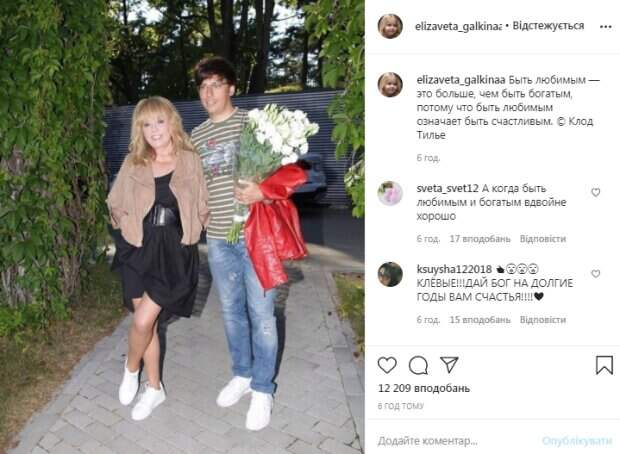 Рядом стоял Галкин, который держал в руках букет цветов, а другой рукой обнимал свою жену. «Быть любимым — это больше, чем быть богатым, потому что быть любимым означает быть счастливым. Клод Тилье», - подписан снимок. В комментариях под фото разгорелась настоящая дискуссия. Подписчики стали обсуждать, что лучше – деньги или счастье. «А когда быть любимым и богатым вдвойне хорошо», «Красивая пара, будьте счастливы», «Любить и быть любимым, любимой, ваш случай», «Красиво! Гармонично! Счастья Вам», «Завистливые пусть завидуют сколько угодно. Вы красивая пара очень, но наша Аллочка, самая, самая лучшая и красавица!», - пишут пользователи сети. Но нашлись и те, кто набросился на примадонну со словами критики. «Жила бы на пенсию 8500, посмотрели бы на их счастье», «Если бы не была богатой, не стала бы любимой», - пишут подписчики. Напомним, что соседи Аллы Пугачевой и Галкина сболтнули лишнего об их разводе: "Придется все делать самой...". А еще Politeka писала, что Максим Галкин и Киркоров не сдержали эмоций, узнав о важных переменах в семье Орбакайте: "Surprise!". Также Politeka сообщала, что личное видео развлечений Галкина с помолодевшей Пугачевой взорвало Сеть: «Ляпота».