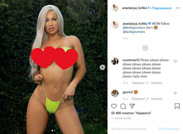 Девушка продемонстрировала свое роскошное тело в двух разных купальниках. Так, на первом фото она позирует перед камерой в крошечном бикини, которое едва скрывает ее объемную грудь. На втором снимке Лейси повернулась к камере спиной, засветив свои впечатляющие ягодицы в слитном красном купальнике. Формы красотки явно никого не смогут оставить равнодушным. Поклонники Квитко не смогли пройти мимо и тут же засыпали ее подругу лайками и восторженными комментариями. Ранее мы писали, что Квитко похвасталась солнечным фото, сделанным во время отдыхе на природе. Позируя на фоне зеленой листвы, загорелая модель выглядела весьма привлекательно в синем бикини. Настя является рекламным представителем нижнего белья и купальников известного бренда, поэтому в ее профиле есть довольно много различных провокативных кадров. Благодаря своим пышным формам и тонкой талии девушка всегда эпатирует публику по-разному. В этот раз модель выбрала бикини насыщенно-синего оттенка на завязочках-шнуровке на груди и бедрах, тут же соблазнив поклонников, поскольку измазалась шиммером для блеска тела. Напомним, русская Кардашьян в эффектном синем бикини измазала "дыньки" маслом: "Как мед!". Как сообщала Politeka, русская Кардашьян приспустила лифчик в жаркой позе на песке. Также Politeka писала, что русская Кардашьян в мини-бикини загипнотизировала роскошными формами.